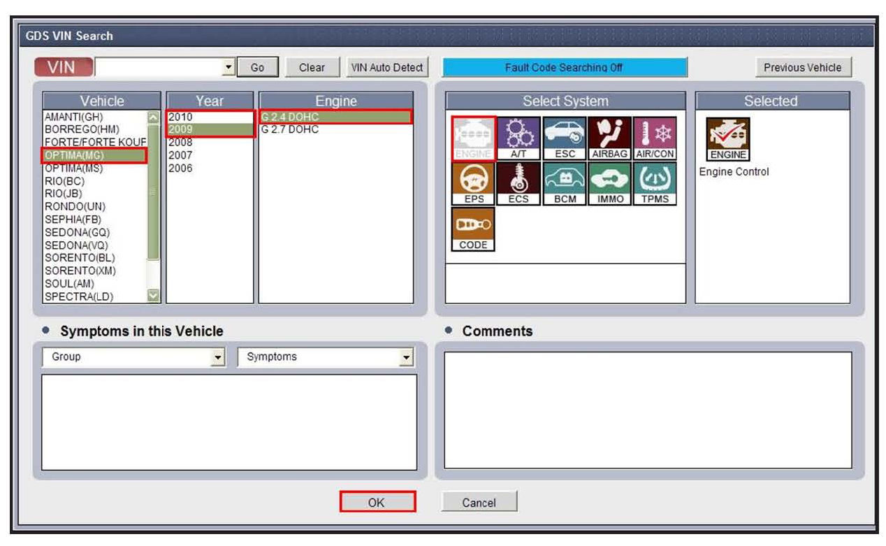 5, With the ignition key ON turn ON the VCI and GDS tool. Access the GDS vehicle identification number (VIN) screen and configure the vehicle using the VIN AUTO DETECT Function.
