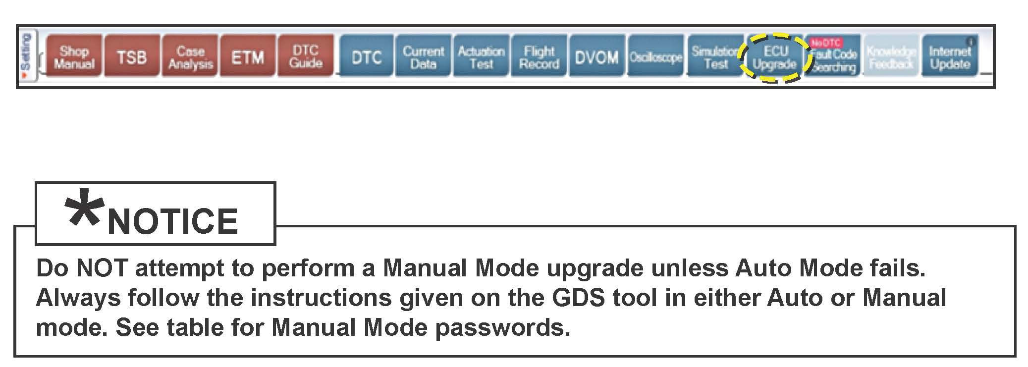 6. Once back at the GDS Main Screen select ECM upgrade from the bottom righthand corner. Next select Auto Mode Engine Perform the ECM upgrade in accordance with normal GDS too ECM upgrade procedures.