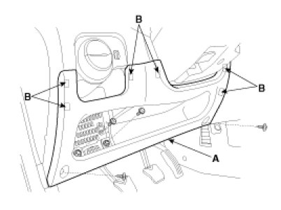 2. Remove the crash pad lower panel (A) . Take care of fixing clips(B).