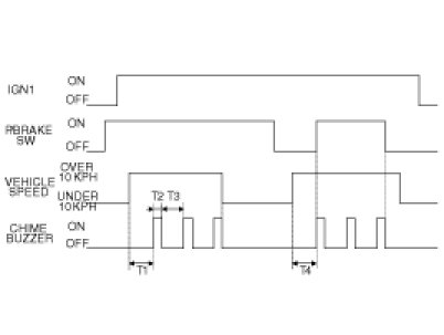 (1) In state of IGN1 SW ON or PARKING BRAKE engaged, when the vehicle speed is keeping more than 10 Km/h, output the CHIME BUZZER continuously as 1s cycle of 0.3s(ON) and 0.7s(OFF).