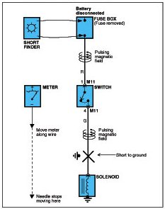 A short finder is available to locate a short to ground. The short finder creates a pulsing magnetic field in the shorted circuit and shows you the location of the short through body trim or sheet metal.