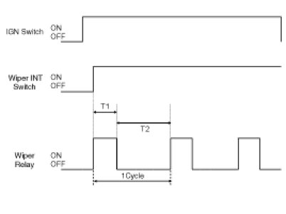 (1) Rear Wiper Relay is turned ON after T1 When Rear Washer switch is turned ON at the status of IGN2 ON. If input of Rear Washer switch is less than 0.2sec and more than 0.06sec, Rear Wiper Relay is turned OFF after T3. Ignore the input of Rear Washer switch operating Rear Washer interlocking Rear Wiper accepts the input of Rear Washer switch after the operating Rear Washer interlocking Rear Wiper.