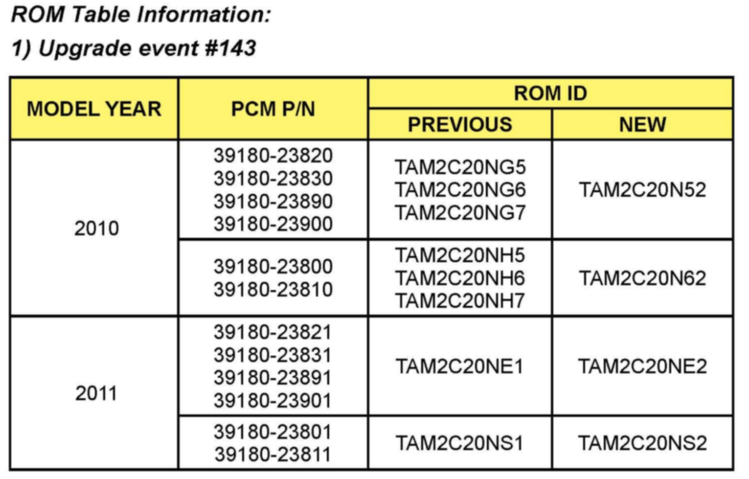 To verify the vehicle is affected, be sure to check the Calibration Identification of the vehicle's ECU's ROM ID and reference the Information Table as necessary.