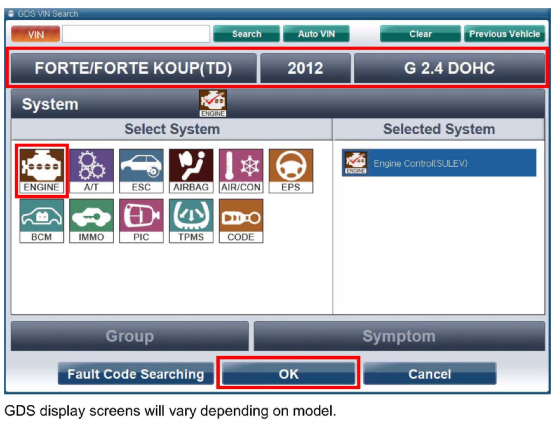 5. With the ignition key ON, turn ON the VCI and GDS tool. Access the GDS vehicle identification number (VIN) screen and configure the vehicle using the VIN Auto Detect function.