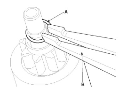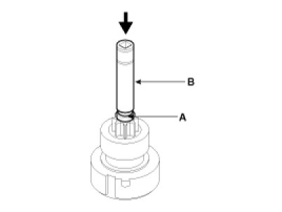 Using a suitable pulling tool (A), pull the overrunning clutch stop ring (B) over the stopper (C).