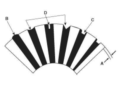 6. Check the mica depth (A). If the mica is too high (B), undercut the mica with a hacksaw blade to the proper depth. Cut away all the mica (C) between the commutator segments. The undercut should not be too shallow, too narrow, or v-shaped (D).