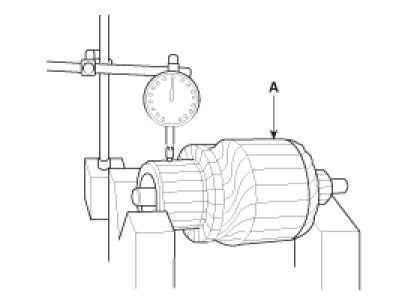 4. Check the commutator (A) surface. If the surface is dirty or burnt, resurface with emery cloth or a lathe within the following specifications, or recondition with #500 or #600 sandpaper (B).