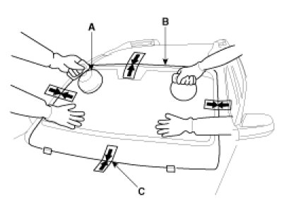 5. Install the spacer (A). Install the windshield glass (B) temporarily marking sure to position them on the center, and then place an alignment mark (C).