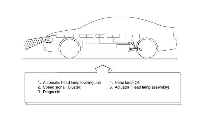 4. On driving : If vehicle velocity is over 4km/h(2.48mile/h), velocity change is not over 0.8-1.6km/h(0.5 - 1.0mile/h) per second, and loading condition is changed, then head lamp is operated.