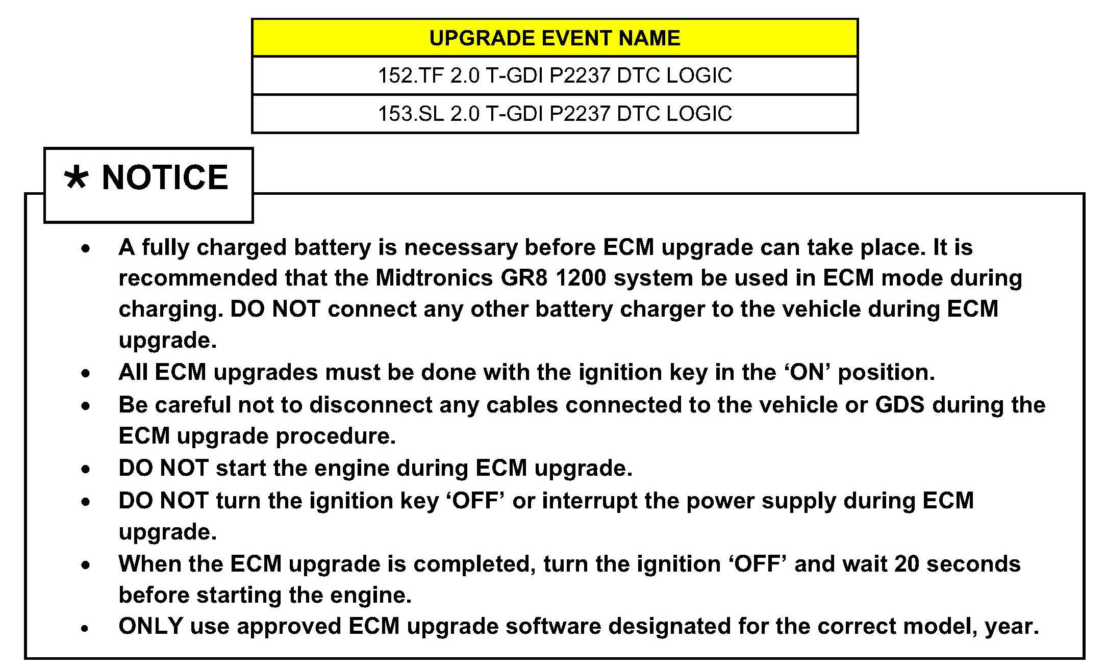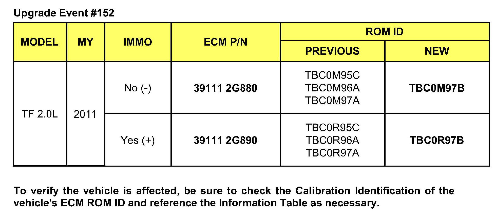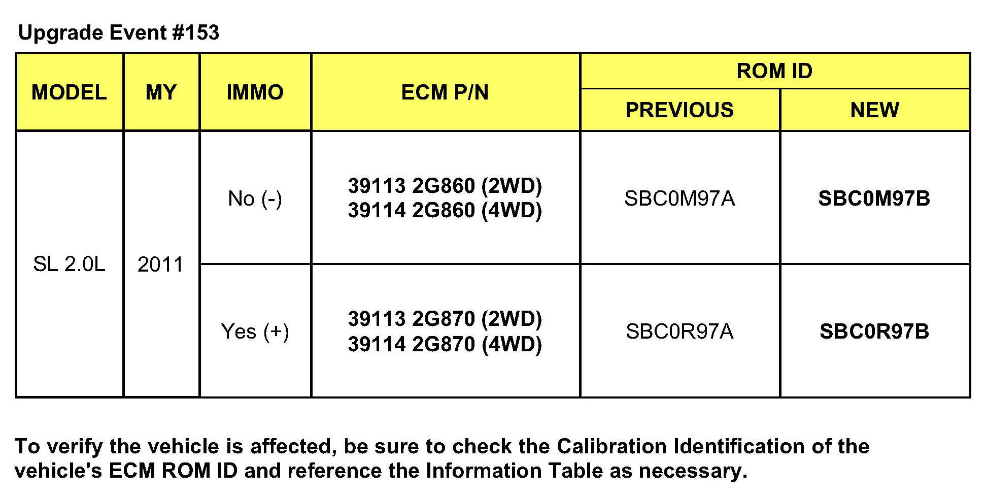 This bulletin provides information for ECM software upgrade of some 2011 MY Optima (TF) vehicles produced from December 24, 2010 - March 3, 2011 and Sportage (SL) vehicles produced from December 30, 2010 - March 8, 2011 with 2.0L T-GDI engines which may experience a Malfunction Indicator Lamp illuminated with the ECM (Electronic Control Module) system-related DTC P2237. DTC logic improvement is included in this ECU upgrade. For confirmation that the latest reflash has been done to a vehicle you are working on verity ROM ID using the tables in this TSB. To ensure maximum customer satisfaction Kia is requesting the completion of this Service Action on all affected 2011 Optima (TF) and Sportage (SL) vehicles.