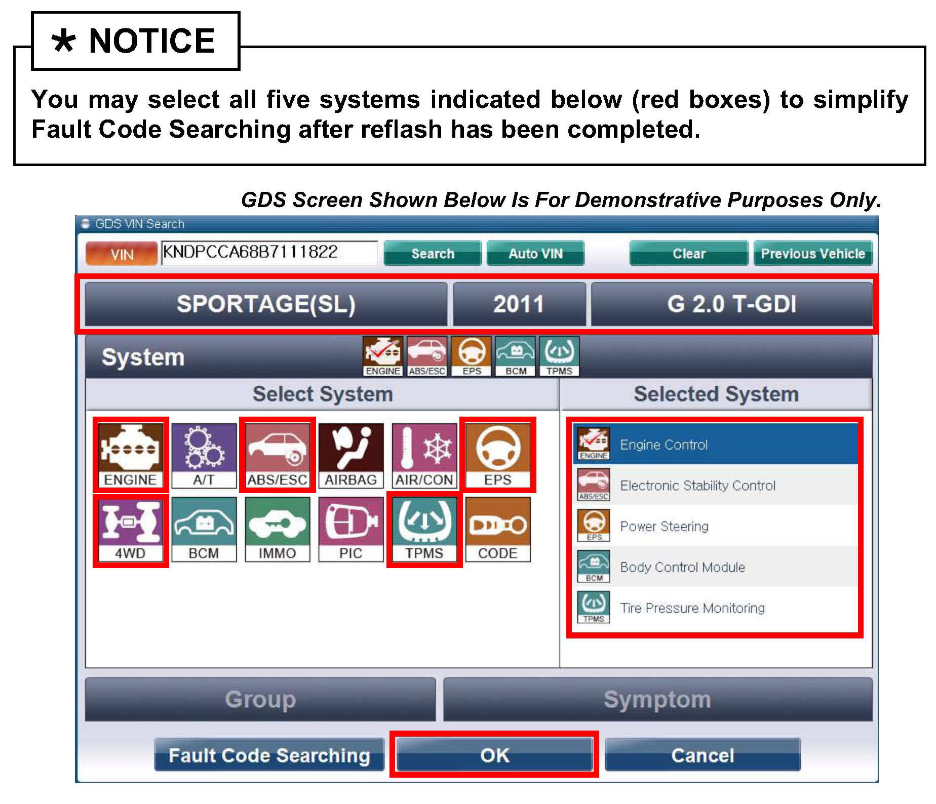 8. Previously selecting systems indicated by the Notice below step 5 will make it easier to complete this step. No need to close, just select Fault Code Search. Run Fault Code Searching to erase any DTCs such as EPS ESC and TPMS. Due to CAN BUS multiple DTCs may be set during reprogramming.