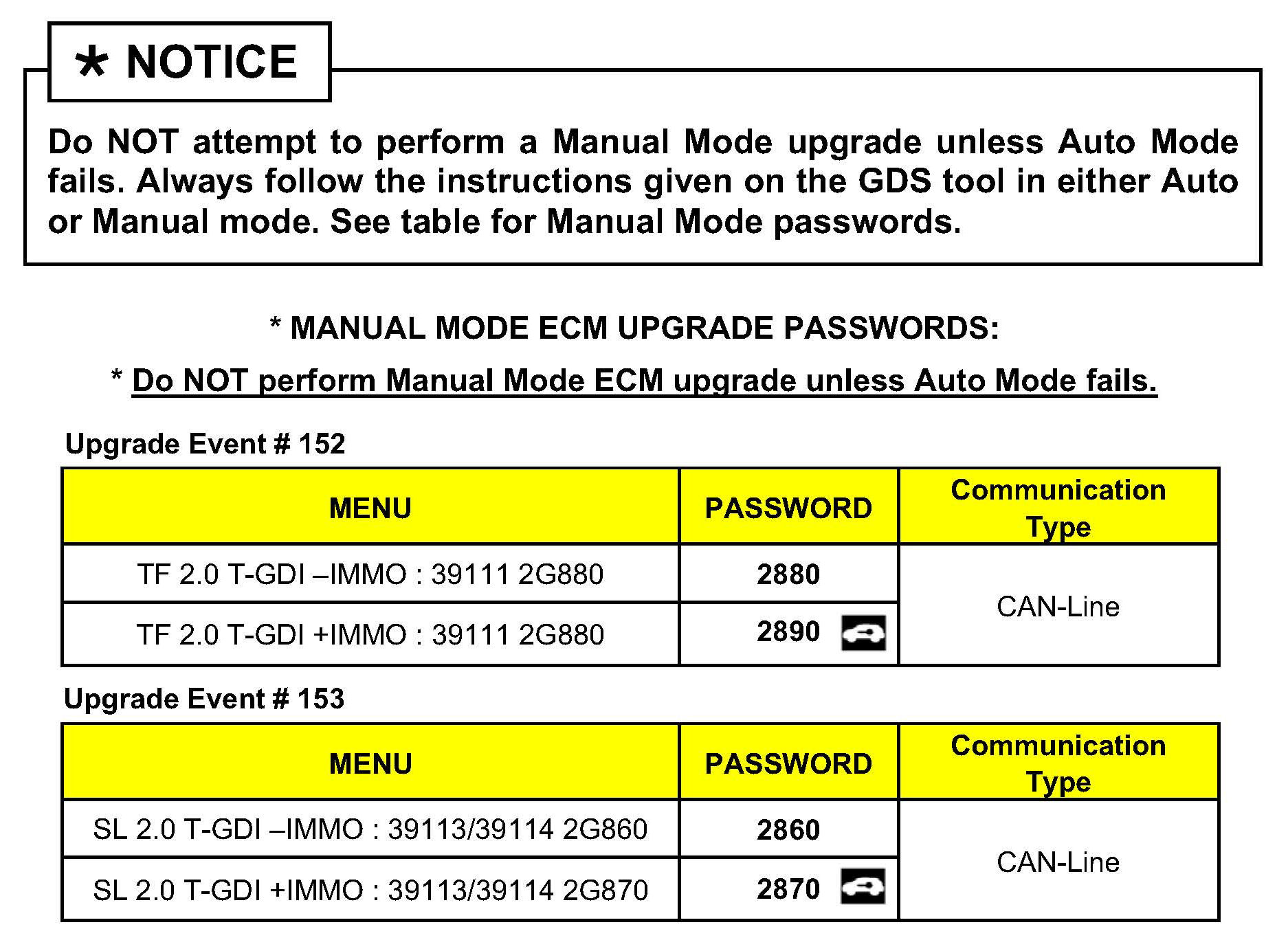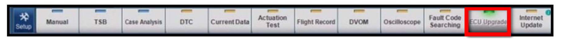 6. Once back at the GDS Main Screen, select ECU Upgrade from the bottom right-hand corner. Next select Auto Mode, and then Engine. Perform the ECM upgrade in accordance with normal GDS tool ECM upgrade procedures.