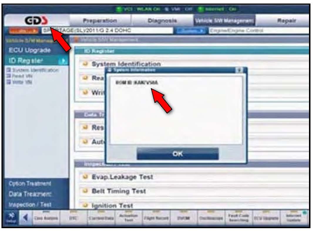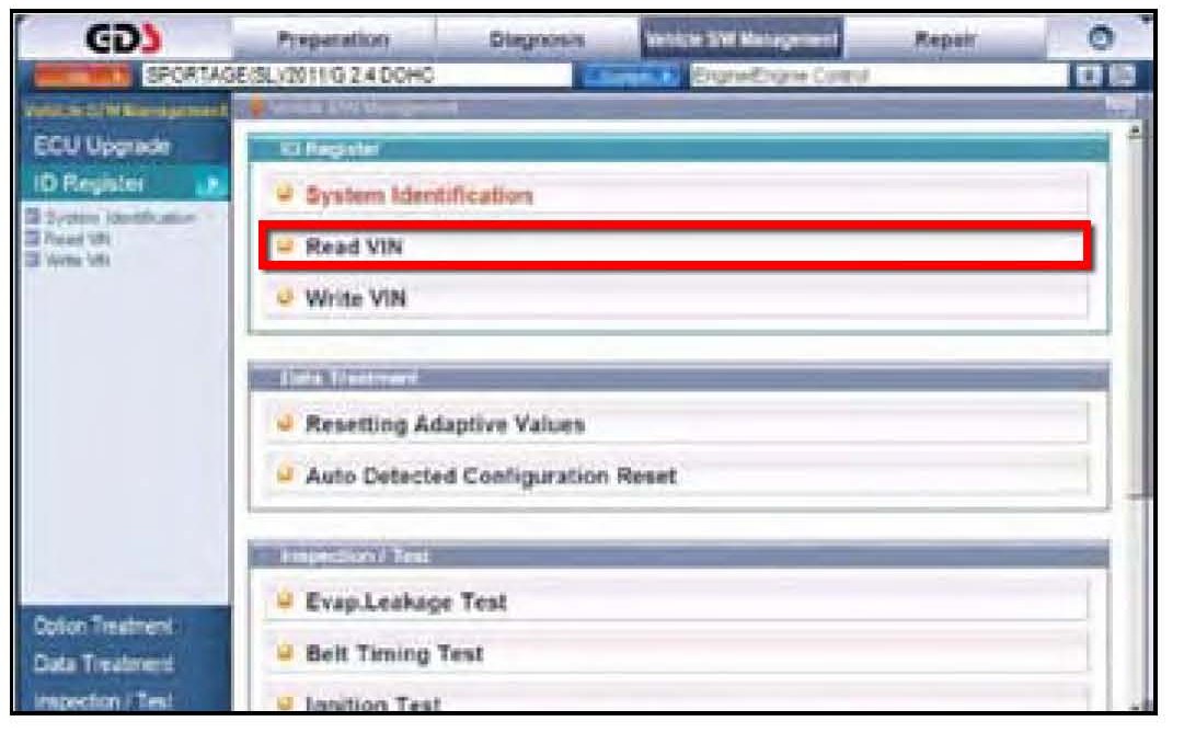 4. To verify the VIN, select "Read VIN" under the "Vehicle S/W Management" menu. Click "OK" and write down the VIN for later form entry.