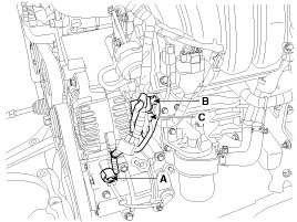3. Disconnect the A/C compressor switch connector (A) the alternator connector (B), and the cable from alternator "B" terminal (C).