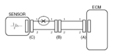 - Disconnect connector (B), and measure for resistance between connector (C) and (B1) and between (B2) and (A) as shown in Fig 3.