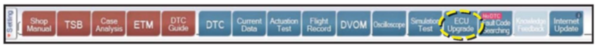 6. Once back at the GDS Main Screen, select "ECU Upgrade" from the bottom right-hand corner. Next select Auto Mode, Engine. Perform the ECU/PCM upgrade in accordance with normal GDS tool ECU/PCM upgrade procedures.