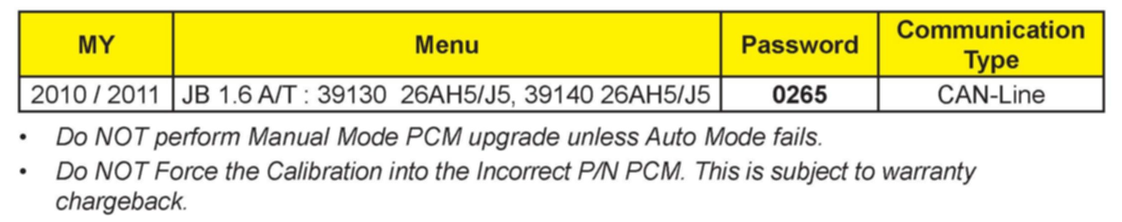 MANUAL MODE PCM UPGRADE PASSWORDS