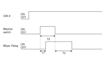 (1) Turn Wiper switch ON after T1 when turning Washer switch on at the status of IGN2 ON and if the input of Washer switch is between 0.06 and 0.2sec, turn the output of Wiper relay OFF after T3. But, ignore the input the input of Washer switch after operating Washer interlocking wiper.