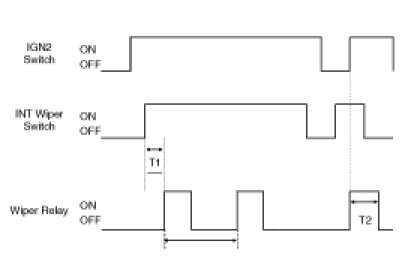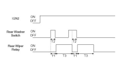 (1) Rear Wiper Relay is turned ON after T1 When Rear Washer switch is turned ON at the status of IGN2 ON. If input of Rear Washer switch is less than 0.2sec and more than 0.06sec, Rear Wiper Relay is turned OFF after T3. Ignore the input of Rear Washer switch operating Rear Washer interlocking Rear Wiper accepts the input of Rear Washer switch after the operating Rear Washer interlocking Rear Wiper.
