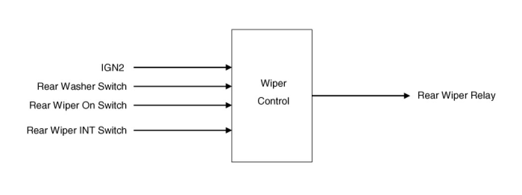 (3) If the input of Rear Washer switch is more than 0.2sec operating Rear Wiper INT, output of Rear Washer interlocking Rear Wiper is turned ON. If the input of Rear Washer is less than 0.2sec, turn the output of Rear Washer interlocking Rear Wiper once.