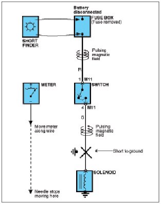 A short finder is available to locate a short to ground. The short finder creates a pulsing magnetic field in the shorted circuit and shows you the location of the short through body trim or sheet metal.