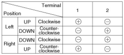 4. Connect the motor terminals directly to a 12 volt battery and check that the motor operates smoothly. Next, reverse the polarity and check that the motor operates smoothly in the reverse direction. If the operation is abnormal, replace the motor.