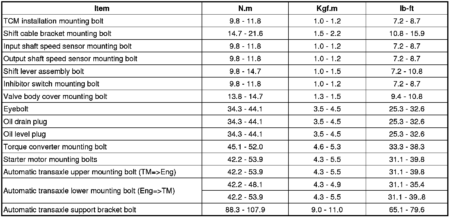 Home >> Kia >> 2012 >> Forte L4-2.0L >> Repair and Diagnosis >> Specifications >> Mechanical Specifications >> Automatic Transmission/Transaxle >> System Specifications