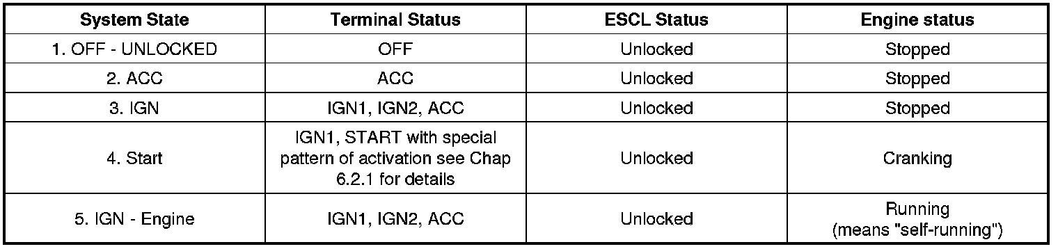 The BES System can be set in 5 different states (OFF LOCKED is not available in virgin mode), depending on the status of the terminals, ESCL and Engine status: