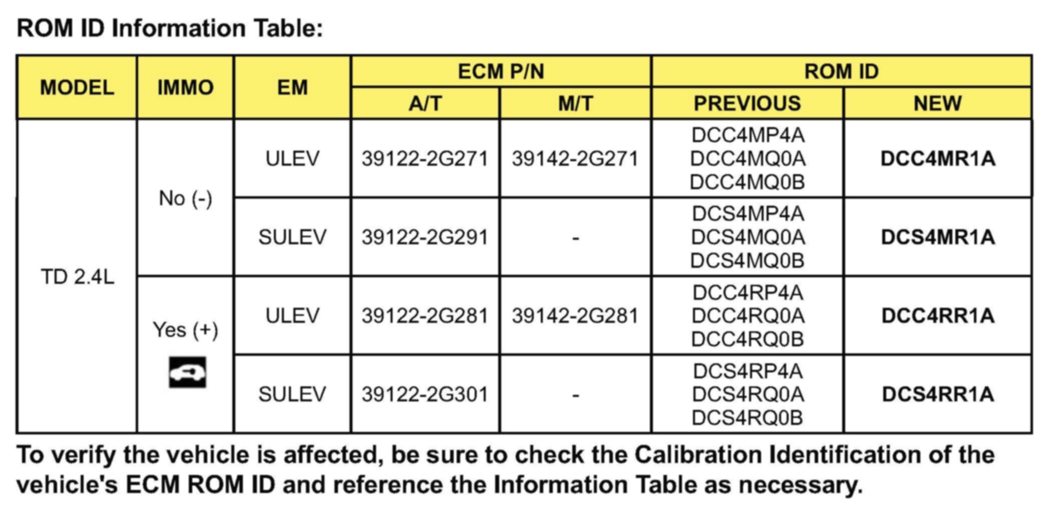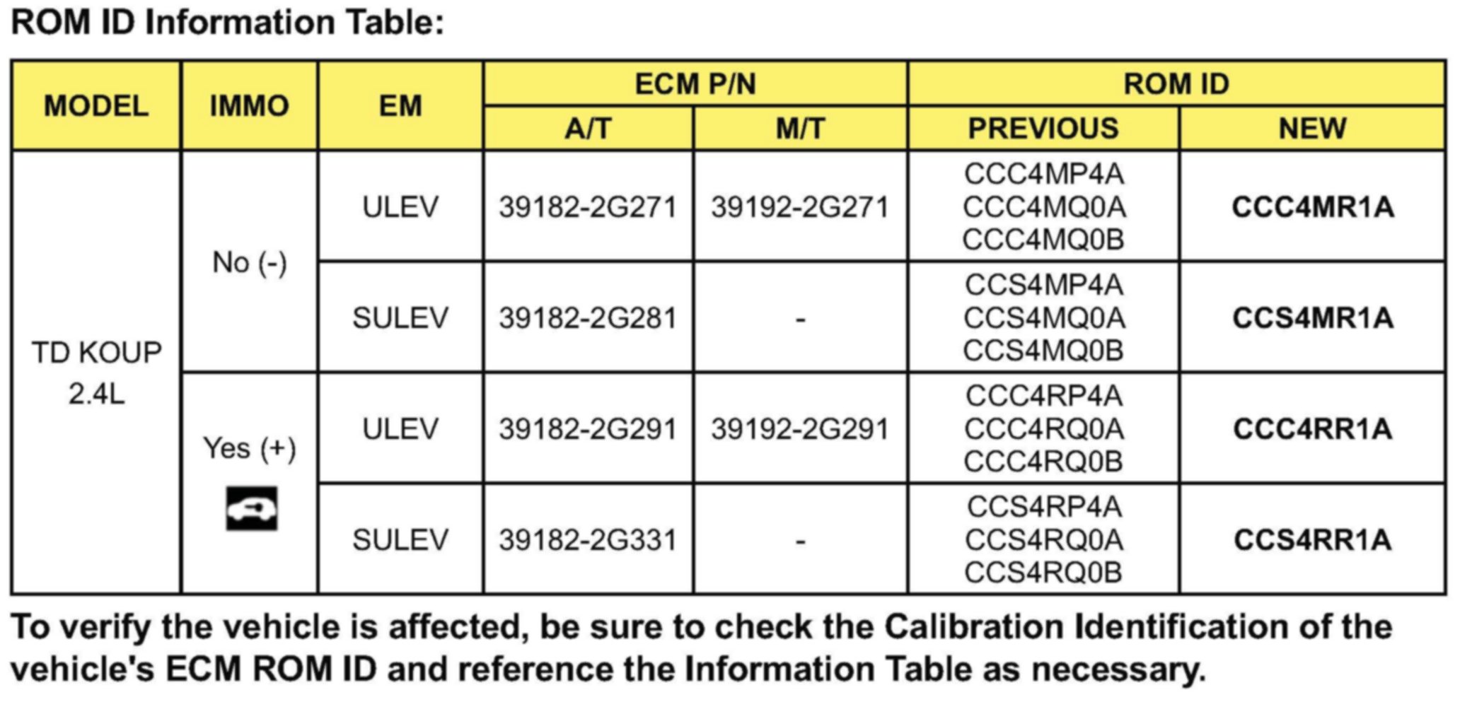 To verify the vehicle is affected, be sure to check the Calibration Identification of the vehicle's ECM ROM ID and reference the Information Table as necessary.