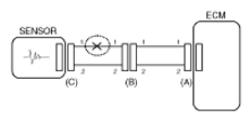 - Disconnect connector (B), and measure for resistance between connector (C) and (B1) and between (B2) and (A) as shown in [Fig 3].