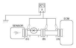 - With each connector still connected, measure the voltage between the chassis ground and terminal 1 of each connectors (A), (B) and (C) as shown in [Fig 4].