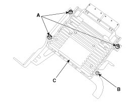 5. Remove the installation nuts (A) and screw (B), and then remove the ECM (C) from the bracket.