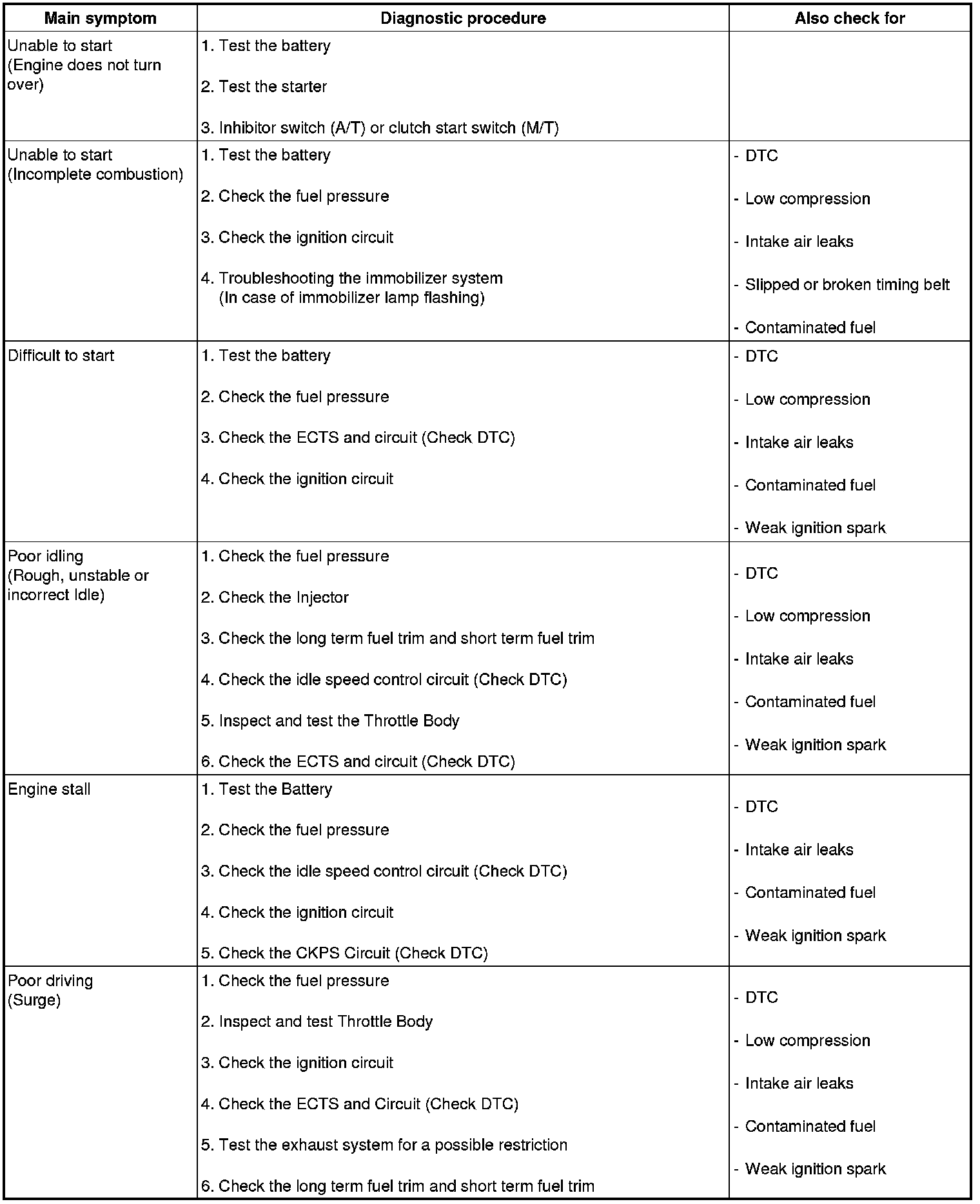 Sometimes the most difficult case in troubleshooting is when a problem symptom occurs but does not occur again during testing. An example would be if a problem appears only when the vehicle is cold but has not appeared when warm. In this case, the technician should thoroughly make out a "Customer Problem Analysis Sheet" and recreate (simulate) the environment and condition which occurred when the vehicle was having the issue.