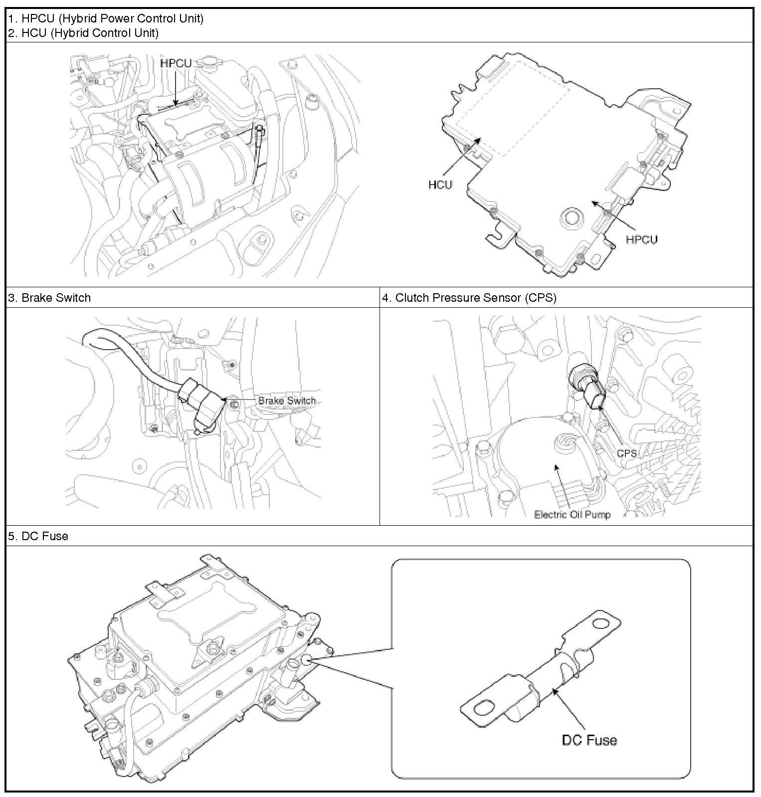 HPCU includes the HCU (Hybrid Control Unit), Inverters (for Drive Motor, HSG and Electric A/C Compressor), MCU (Motor Control Unit) and LDC (Low DC / DC Converter).