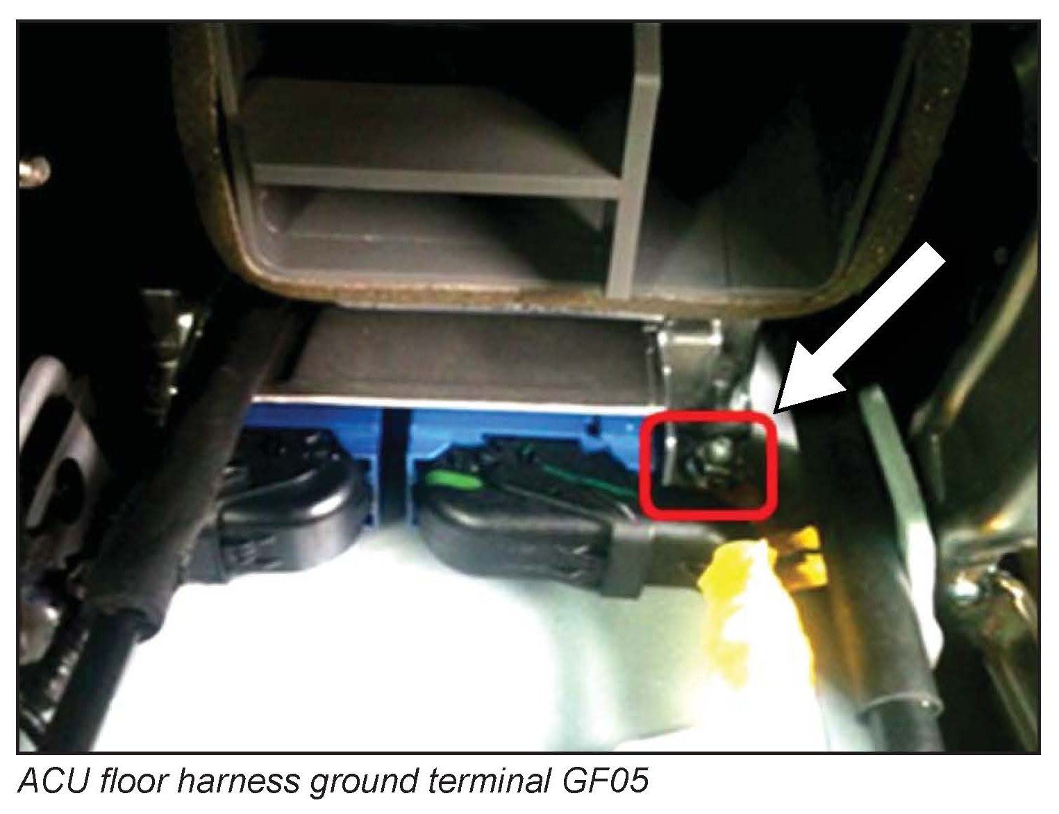 12. Locate the ACU (forward of yaw rate sensor) and remove the floor wiring harness ground nut.