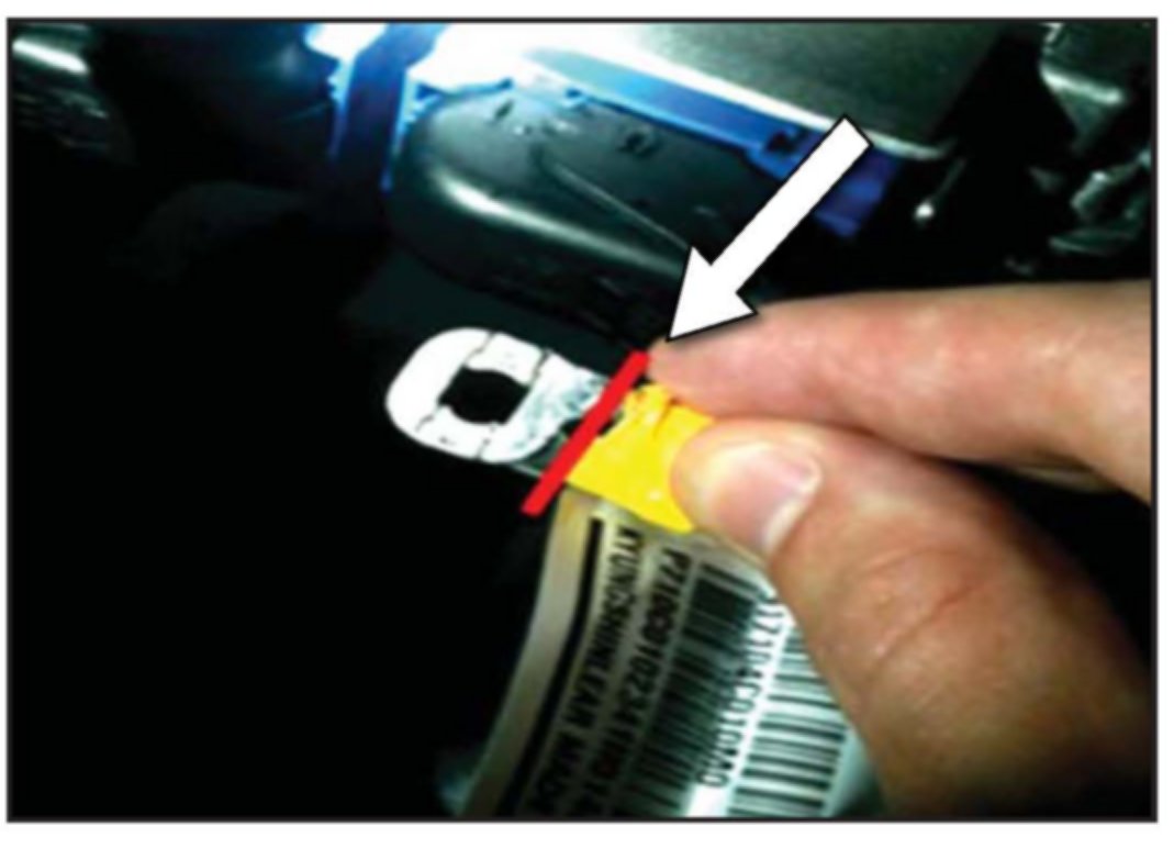 13. Inspect the floor harness ground terminal for excess tape under eyelet and trim tape back to red line in photo. Be sure to remove any paint from stud. This step is critical to promote proper grounding.