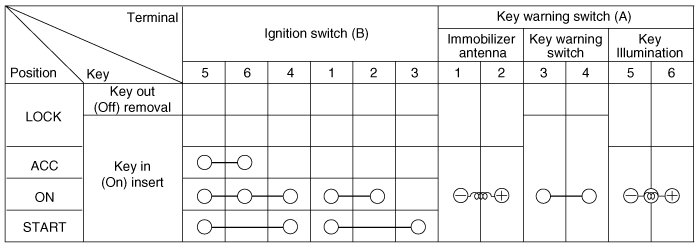 1. Disconnect the ignition switch connector (A) and key warning switch connector (B) from the steering column.