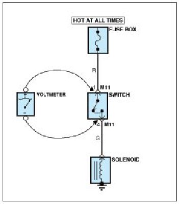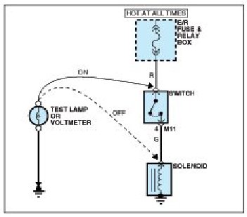 A. Connect one lead of a test lamp or voltmeter to a ground. If you are using a voltmeter, be sure it is the voltmeter's negative test lead you have connected to ground.