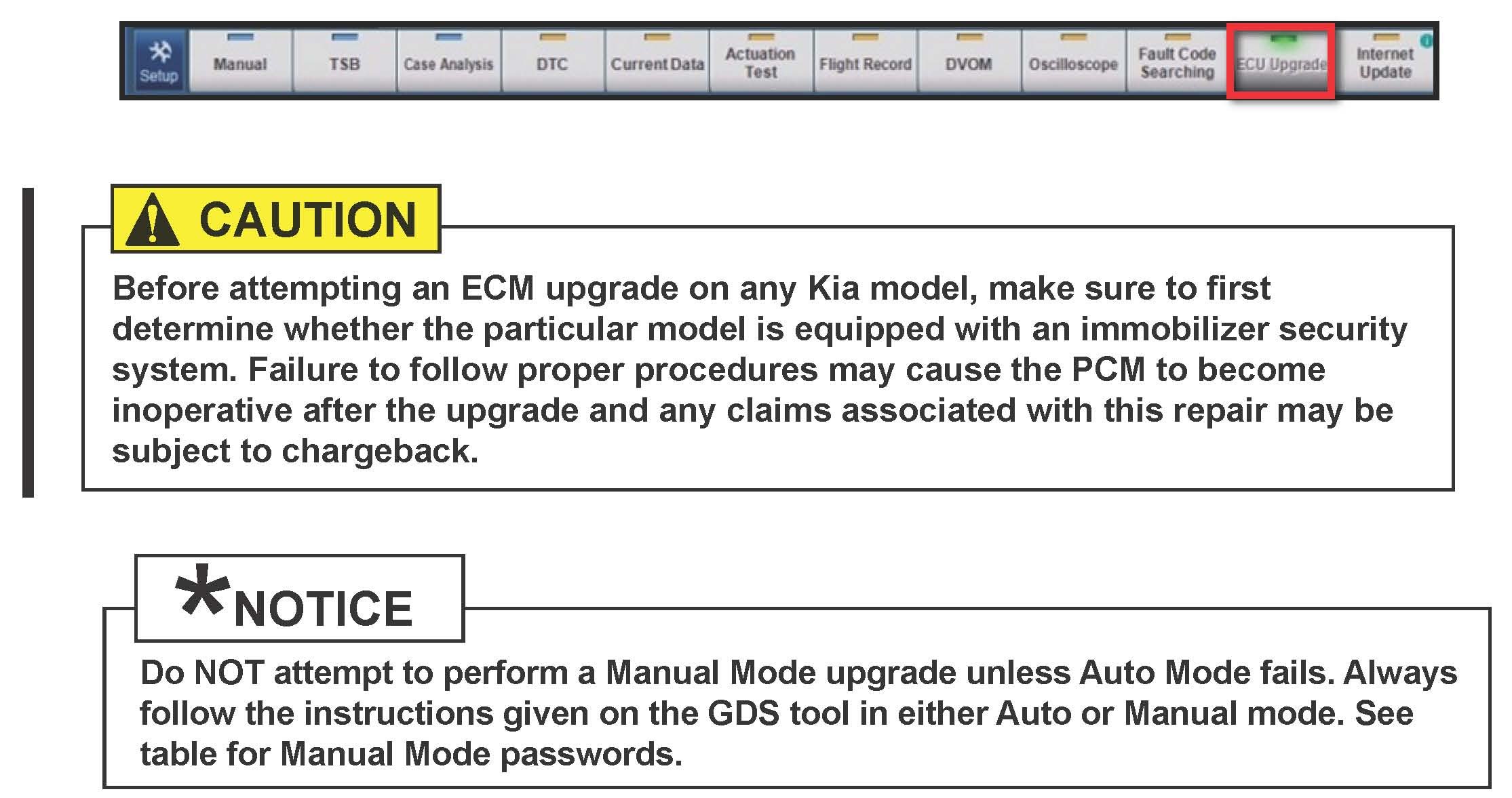 7. Select ECU Upgrade from the bottom right-hand corner. Next select Auto Mode, and then Engine. Perform the ECM upgrade in accordance with normal GDS tool ECM upgrade procedures.