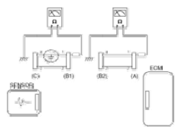 - Disconnect connector (B), and measure for resistance between connector (C) and (B1) and between (B2) and (A) as shown in [Fig 3].