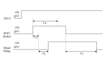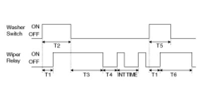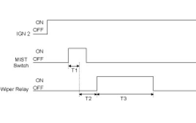 (1) Turn Wiper switch ON after T1 when turning Washer switch on at the status of IGN2 ON and if the input of Washer switch is between 0.06 and 0.2sec, turn the output of Wiper relay OFF after T3. But, ignore the input the input of Washer switch after operating Washer interlocking wiper.