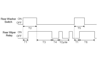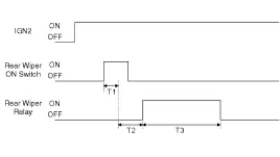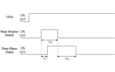 (1) Rear Wiper Relay is turned ON after T1 When Rear Washer switch is turned ON at the status of IGN2 ON. If input of Rear Washer switch is less than 0.2sec and more than 0.06sec, Rear Wiper Relay is turned OFF after T3. Ignore the input of Rear Washer switch operating Rear Washer interlocking Rear Wiper accepts the input of Rear Washer switch after the operating Rear Washer interlocking Rear Wiper.