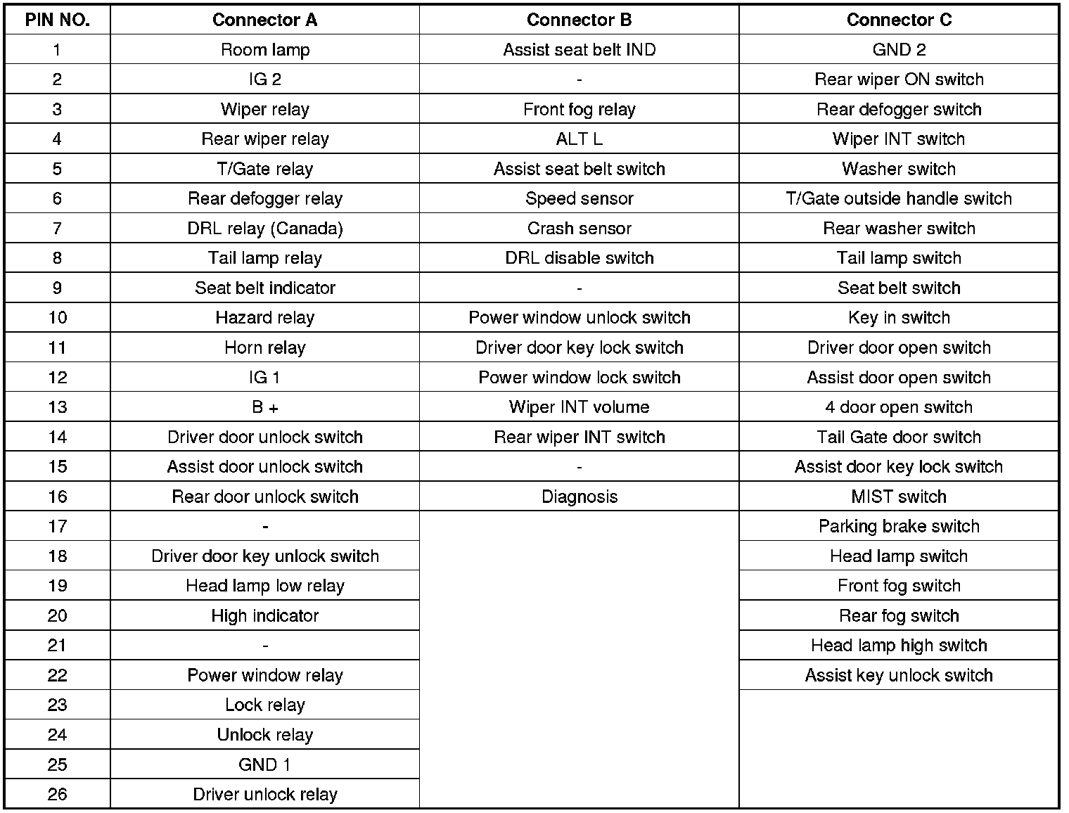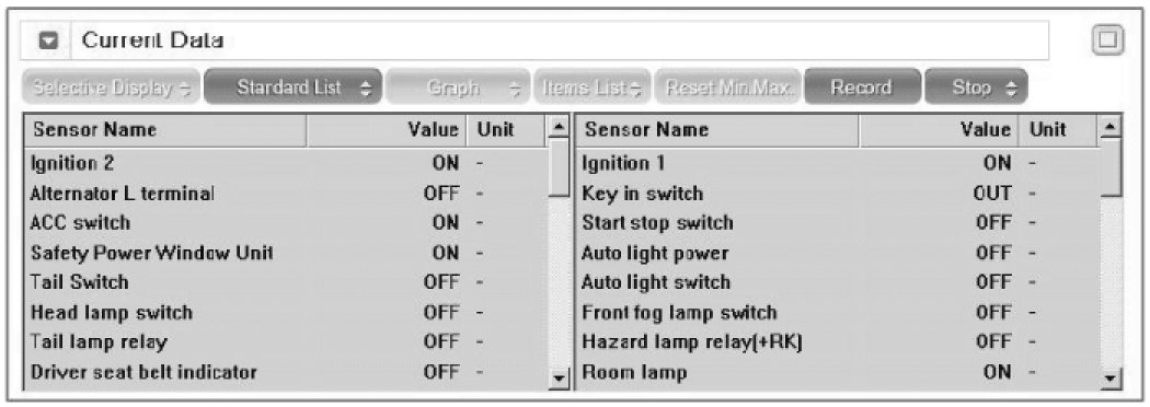 3. To consult the present input/out value of BCM, "Current DATA". It provides information of BCM input/output conditions of power supply, turn signal/brake lamp, headlamp, door locks, outside mirror, wiper, auto-light and transmitters etc.