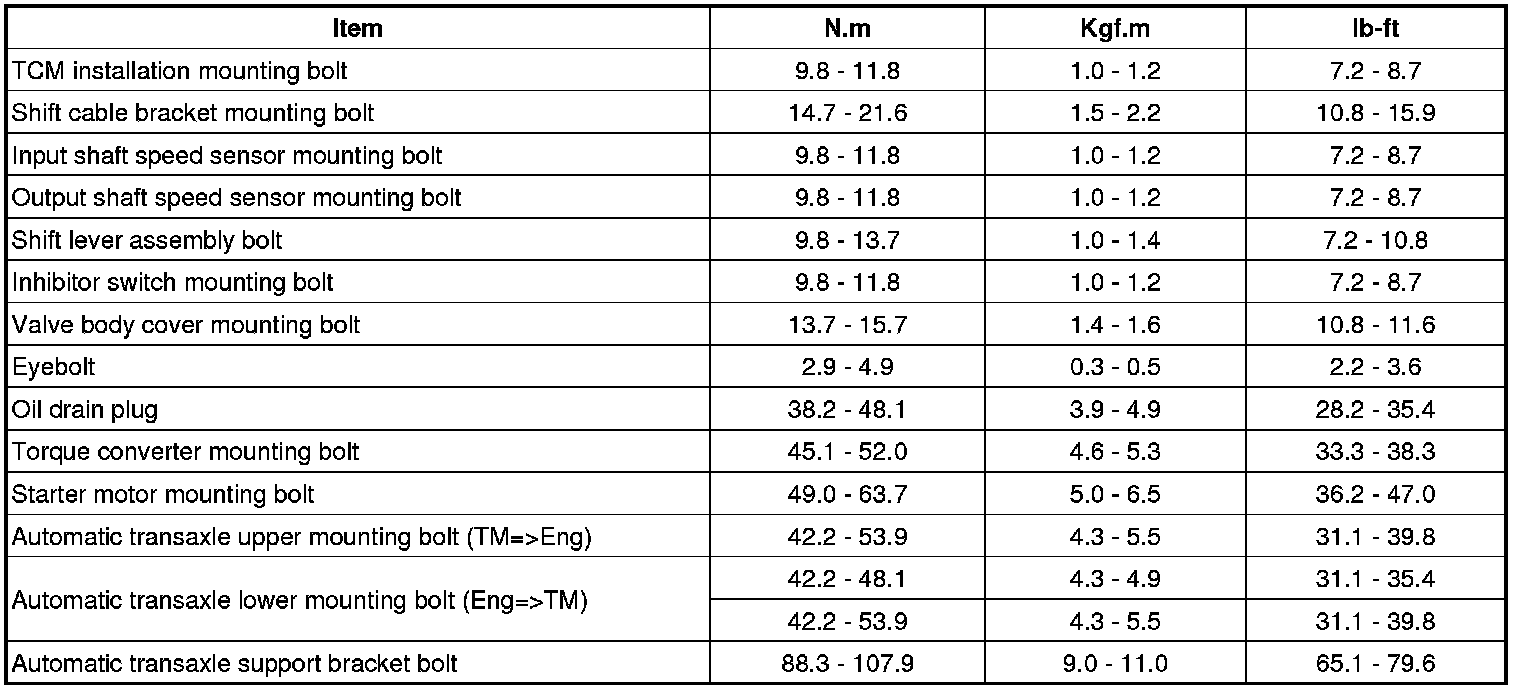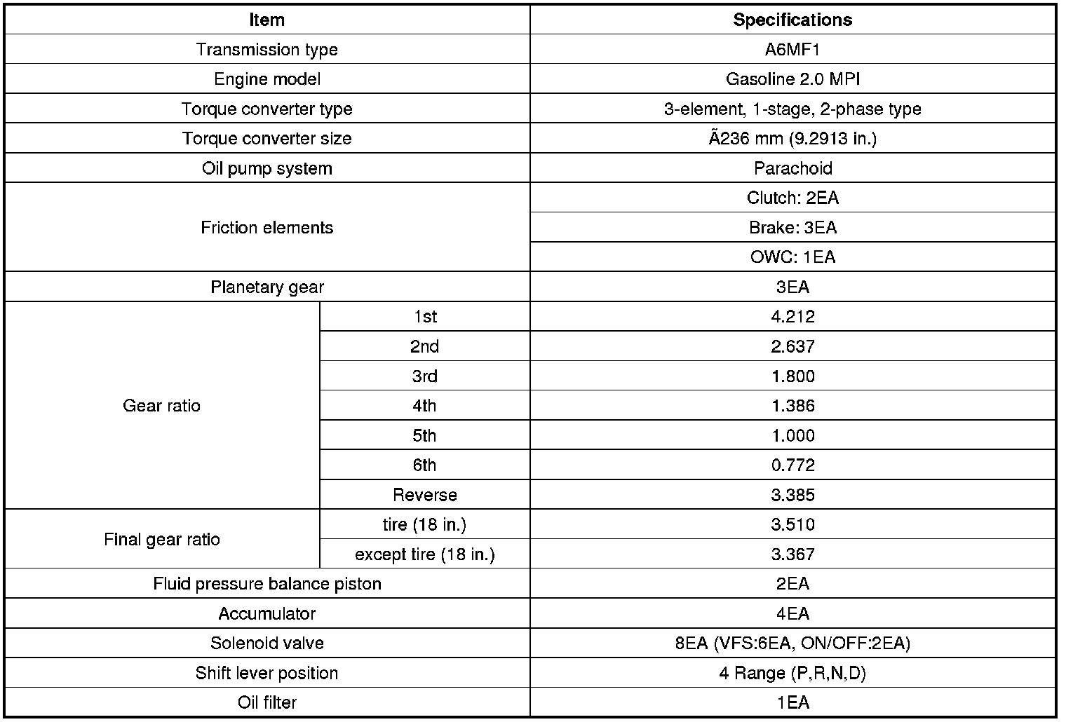 Home >> Kia >> 2012 >> Soul L4-2.0L >> Repair and Diagnosis >> Specifications >> Mechanical Specifications >> Automatic Transmission/Transaxle >> System Specifications