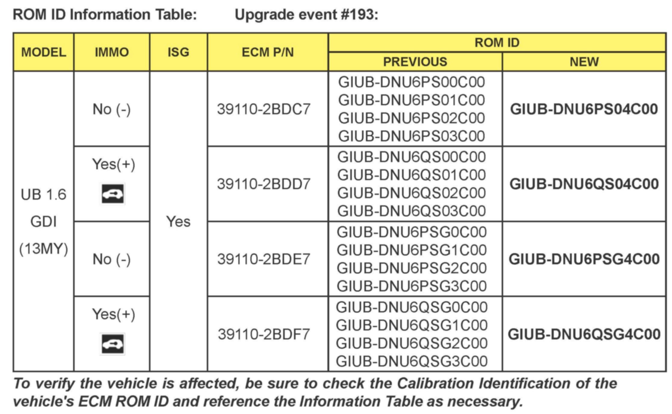 This bulletin provides information related to the ECM software upgrade to improve the ISG control logic of some 2013MY Rio 1.6L GDI vehicles produced from February 23, 2012 to July 17, 2012. Some vehicles may experience intermittent hesitation to automatically restart the engine after ISG system shuts it down as part of its normal operation during an idle stop. To correct this concern, follow the service procedure below For confirmation that the latest reflash has been done to a vehicle you're working on, verify ROM ID using the tables in this TSB. To ensure maximum customer satisfaction Kia is requesting the completion of this Service Action on all affected 2013MY Rio vehicles prior to delivery.