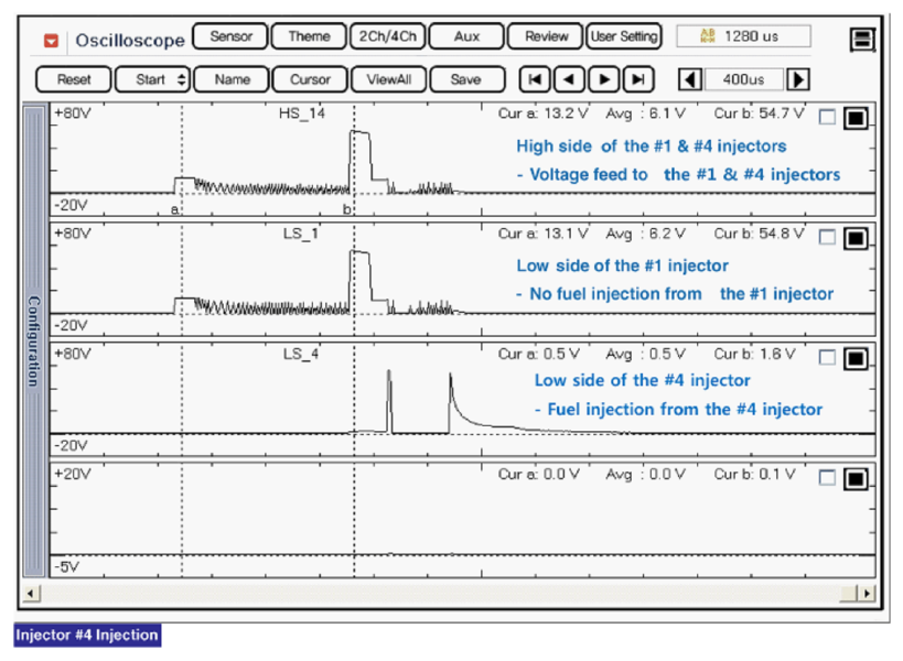 The three waveforms shown in Fig 1 are taken from the #1 and #4 injectors. The top waveform is from the high side (feed side) of the #1 and #4 injectors, while the middle waveform is from the low side (ground side) of the #1 injector and the bottom waveform is from the low side of the #4 injector.