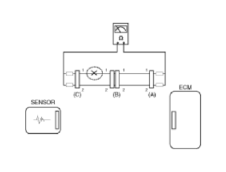 In this case the measured resistance between connector (C) and (B1) is higher than 1MΩ and the open circuit is between terminal 1 of connector (C) and terminal 1 of connector (B1).