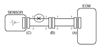 In this case the measured resistance between connector (C) and (B1) is higher than 1MΩ and the open circuit is between terminal 1 of connector (C) and terminal 1 of connector (B1).
