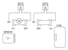- Disconnect connector (B), and measure for resistance between connector (C) and (B1) and between (B2) and (A) as shown in [Fig 3].