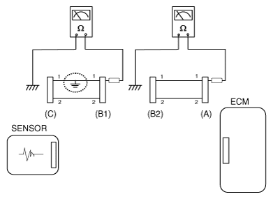 - Disconnect connectors (A), (C) and measure for resistance between connector (A) and Chassis Ground as shown in [Fig 2].